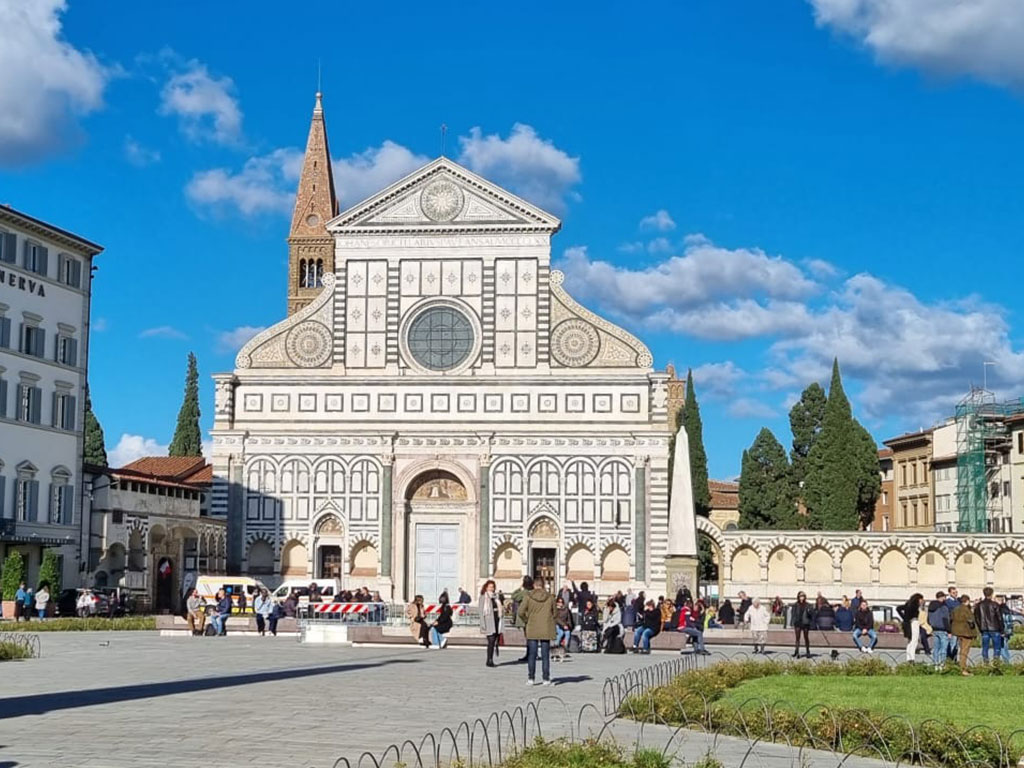 La facciata, lasciata incompiuta, con i suoi mattoni rossi proietta storia dell’ architettura Fiorentina e la ‘ misura ‘ codificata da Leon Battista Alberti.