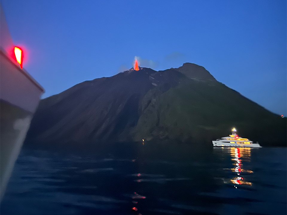 L’ingresso nelle acque antistanti l’isola di Stromboli è stato salutato da un “festoso” gruppo di meravigliosi delfini che si sono esibiti in arditi giochi acrobatici. Il vulcano Stromboli, “Iddu” per gli isolani, è stato altrettanto generoso esibendosi con l’impressionante spettacolo di 4 o 5 fuoriuscite di lava rosso fuoco. Dopo aver gustato a bordo del battello un’ottima pasta al ragù di totano, preparato dalle sapienti mani di Salvatore, la visita a Stromboli è terminata con un incredibile cielo stellato, una scia di meduse fosforescenti, le canzoni e le danze delle Donne in Corriera.
